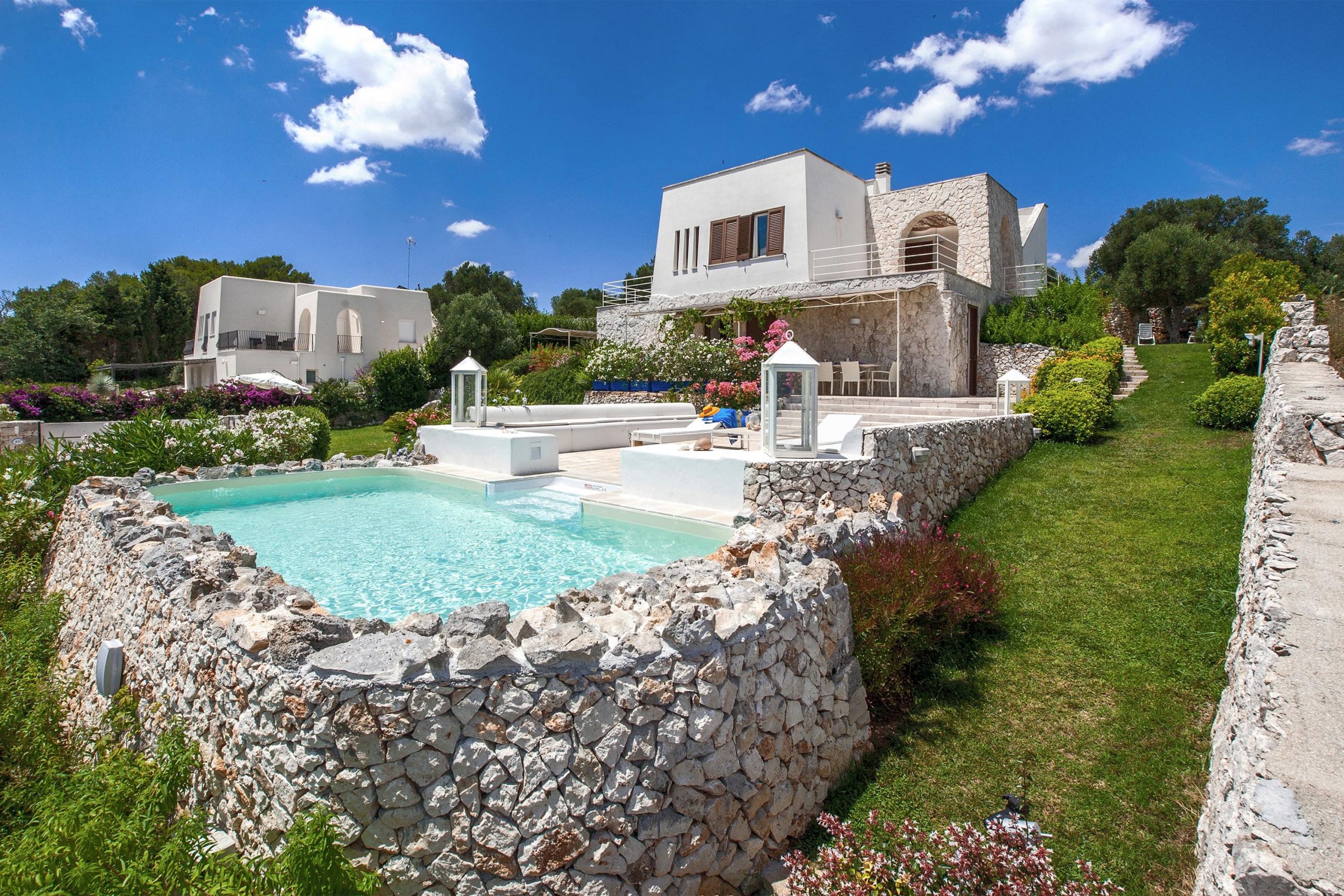 Nel giardino, con i caratteristici muri in pietra che circondano la splendida piscina fronte mare, ci sono varie zone relax: di fronte alla zona living c'è un grande tavolo dove poter pranzare o cenare; una seconda zona è attrezzata con un barbecue e un altro grande tavolo; una terza, al primo piano della villa, è impreziosita da mobili da esterno in legno, ed è il luogo perfetto per bere un cocktail guardando il mare.