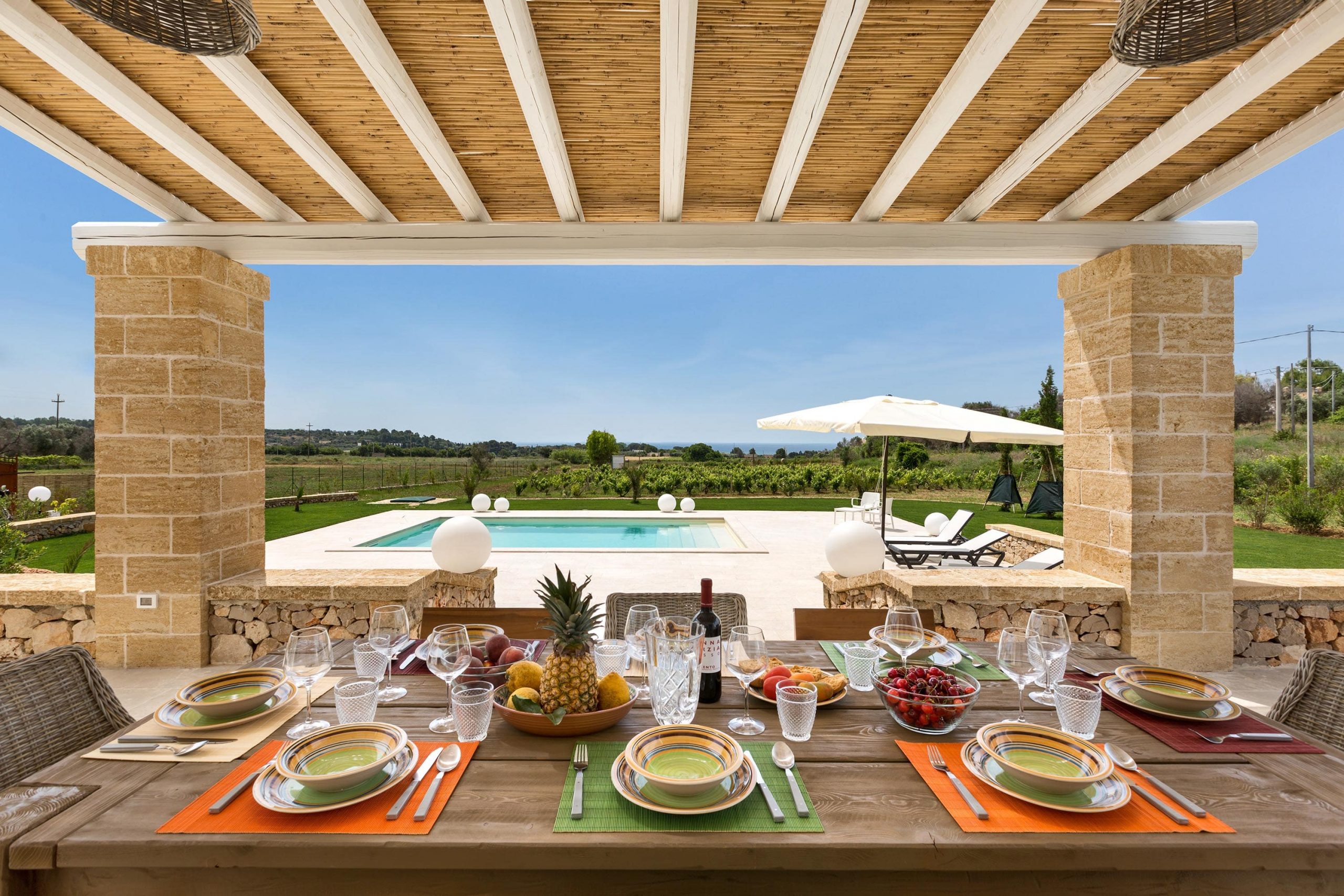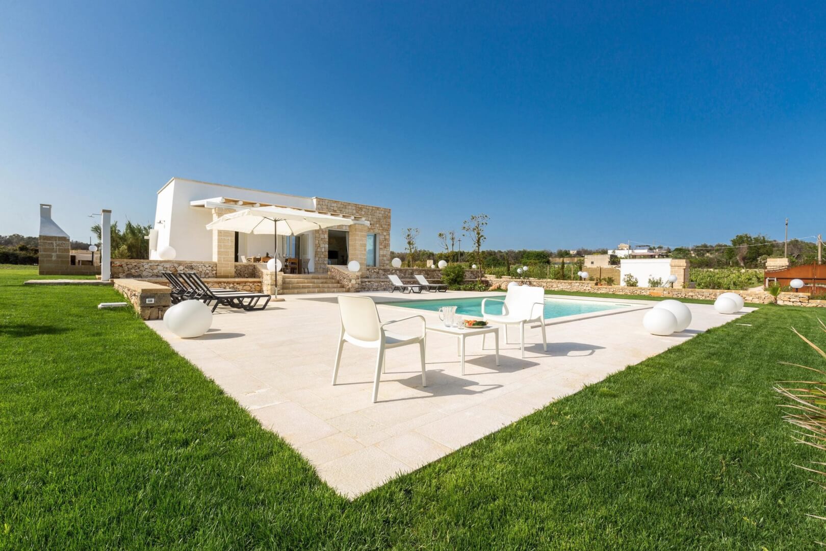 Una bellissima piscina turchese da cui si gode una vista panoramica eccezionale, la dolce brezza marina di Pescoluse che dista solo pochi minuti, i rami degli ulivi che colorano d'argento il paesaggio: tutto questo e molto altro fanno di una vacanza a Villa Pescoluse un'esperienza unica dai contorni autentici. Di recente costruzione, dotata di tutti i comfort moderni, 4 camere da letto e 3 bagni, la villa di lusso realizza il sogno di una vacanza esclusiva in Puglia, situata nel basso Salento, ideale per una vacanza con la famiglia o un gruppo di amici, perché può ospitare fino a 9 persone. Gli animali domestici sono ammessi su richiesta con un piccolo sovrapprezzo. La villa di lusso è di nuova costruzione, ispirata a q tipica architettura rurale, con volte che donano freschezza e la pietra locale che emana armonia. Oltre al tipico vigneto e alla vegetazione mediterranea, c'è un curatissimo giardino con vari spazi dedicati al relax, al piacere e al benessere. La villa, completamente recintata, offre anche un parcheggio interno. La piscina turchese (5x8 metri) è un'oasi di tranquillità con un solarium attrezzato che permette di prendere il sole e rilassarsi su lettini e sdraio sotto gli ombrelloni. Una speciale illuminazione dal basso fa sì che possiate trascorrere le serate a bordo piscina, accompagnati dal dolce canto dei grilli e preparare ottime grigliate utilizzando il barbecue. Inoltre, per mangiare all'aperto, c'è un bel portico ombreggiato, da cui si può ammirare una bella vista panoramica.