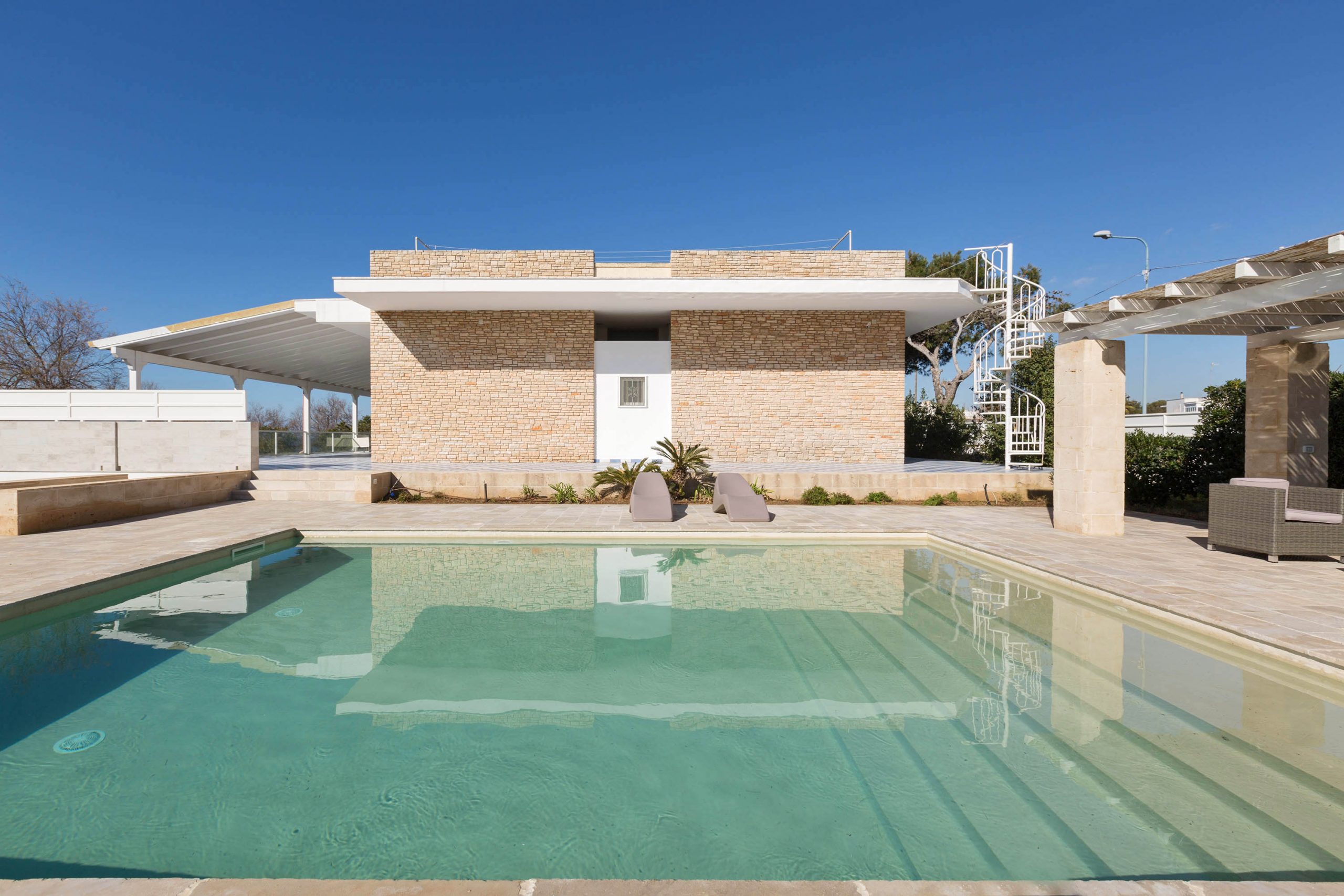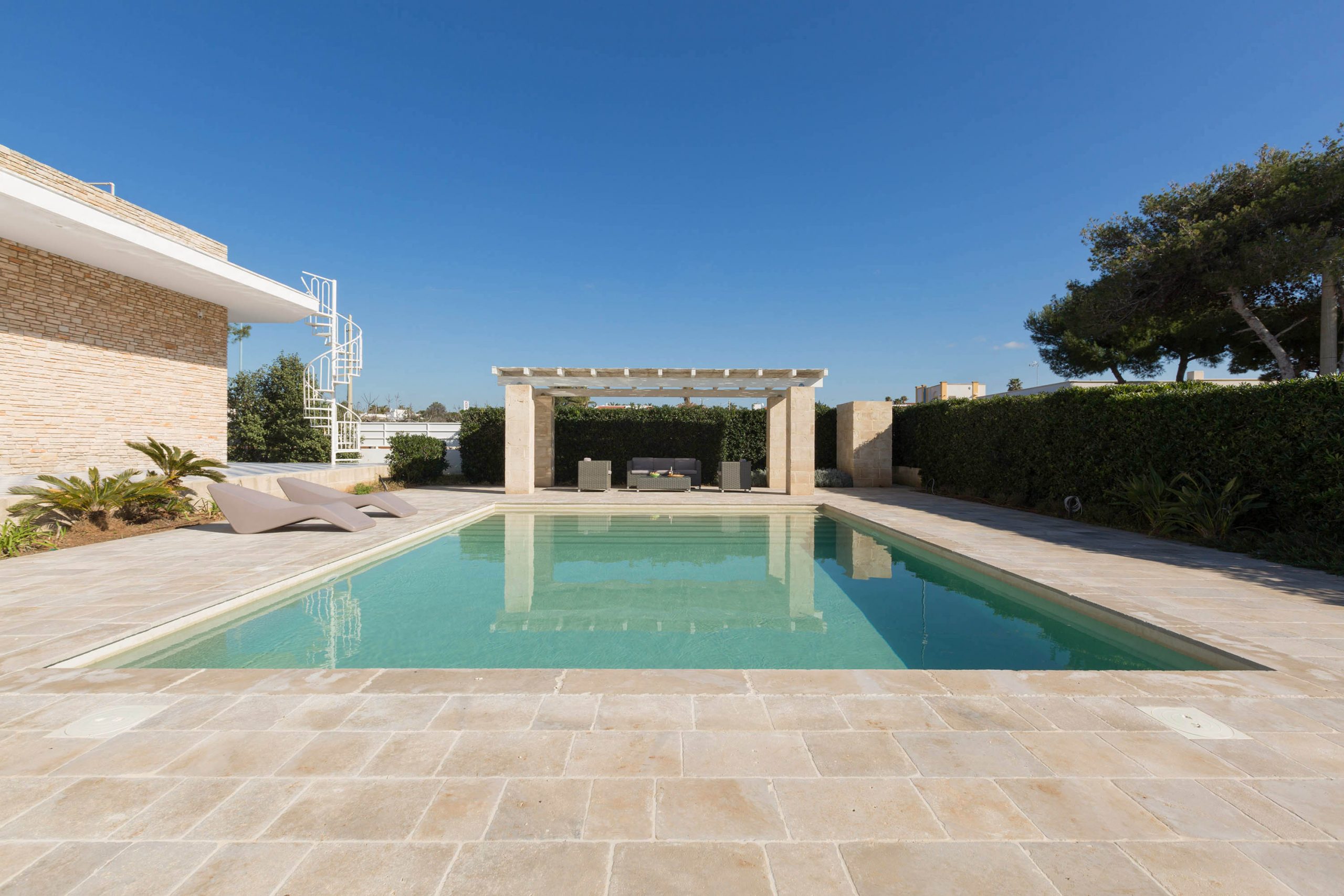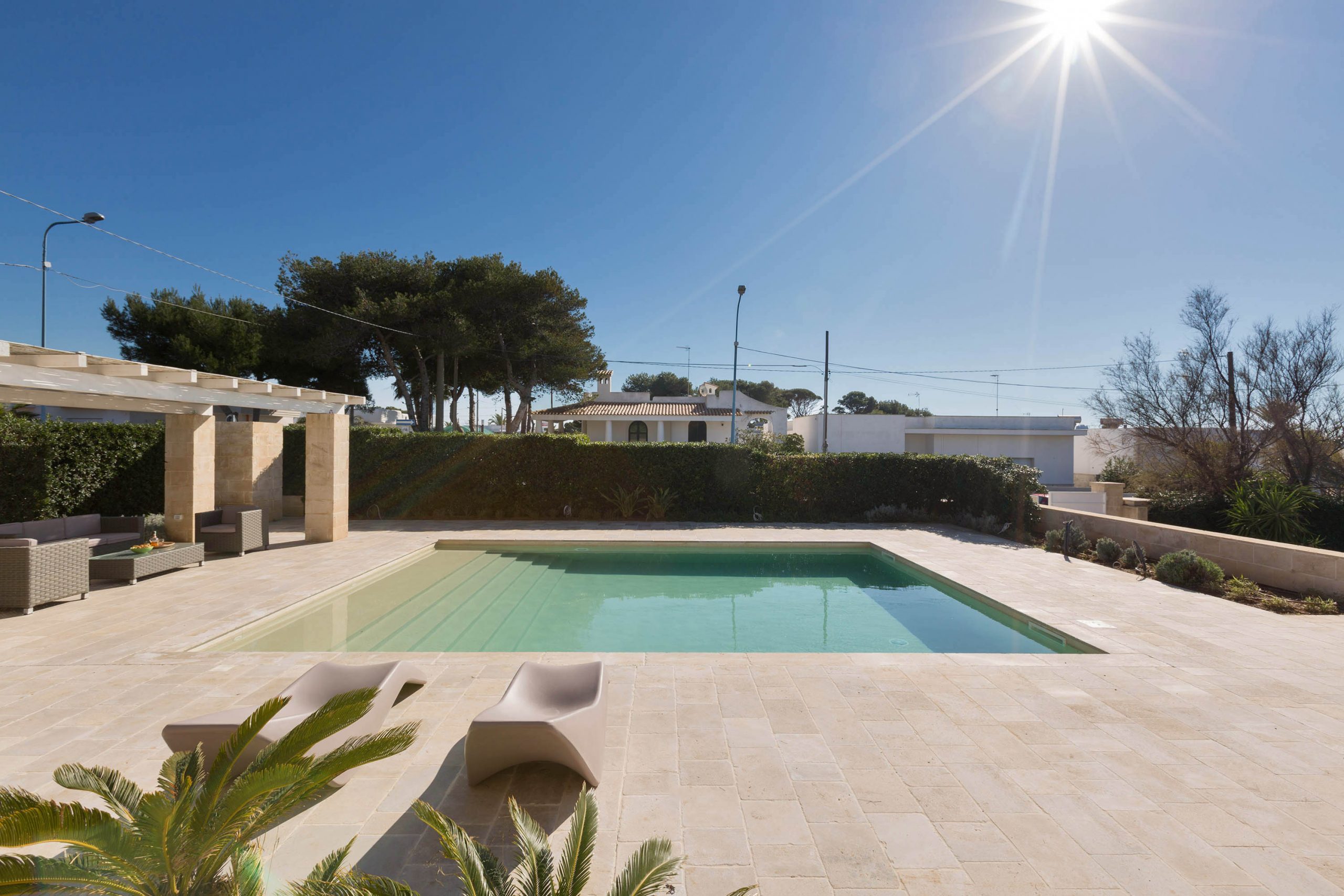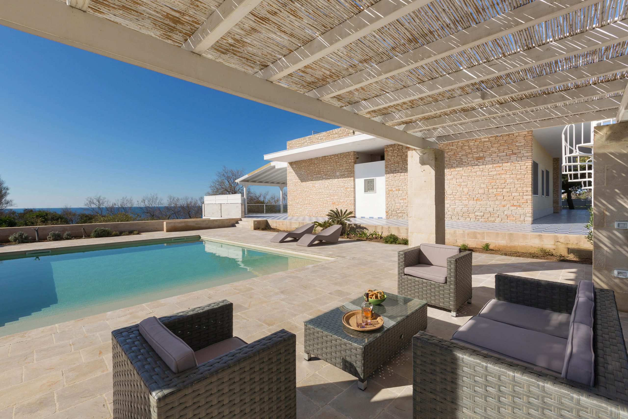 Questa villa ha caratteristiche uniche: la bella piscina con vista sul mare, il fantastico giardino che la collega alla costa e al mare Ionio, la grande veranda ombreggiata per piacevoli momenti all'aperto. A bordo piscina c'è un grazioso gazebo arredato con zona salotto, un bel solarium con lettini di design e una comoda doccia esterna. Il quadro azzurro sullo sfondo rallegra i sensi di chi sogna di trascorrere una vacanza al mare del Salento, con tutti i comfort moderni e la privacy.